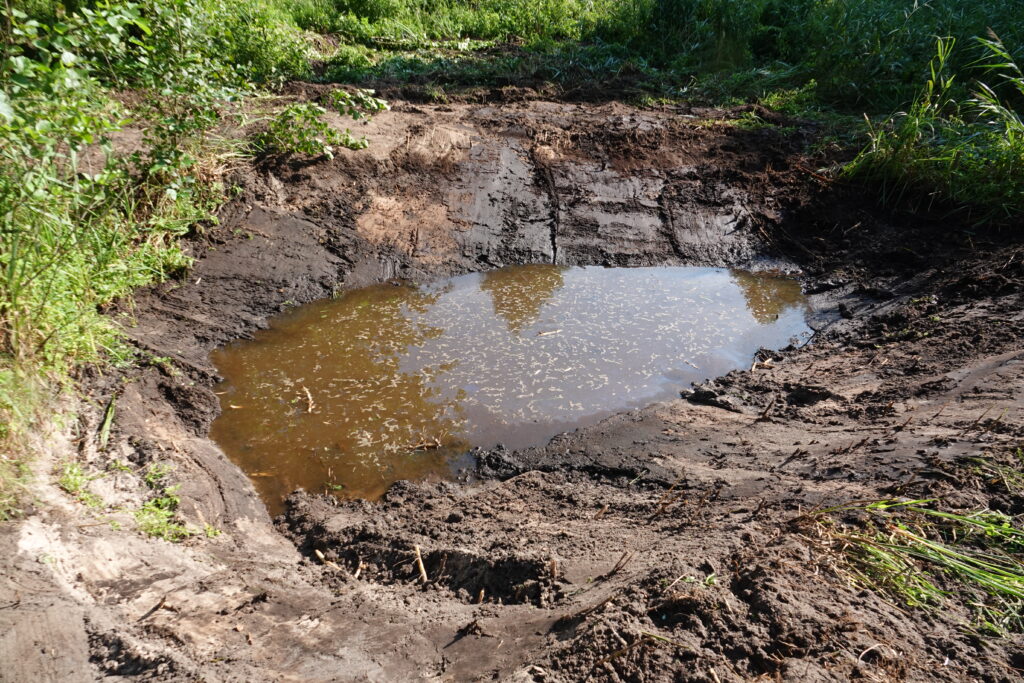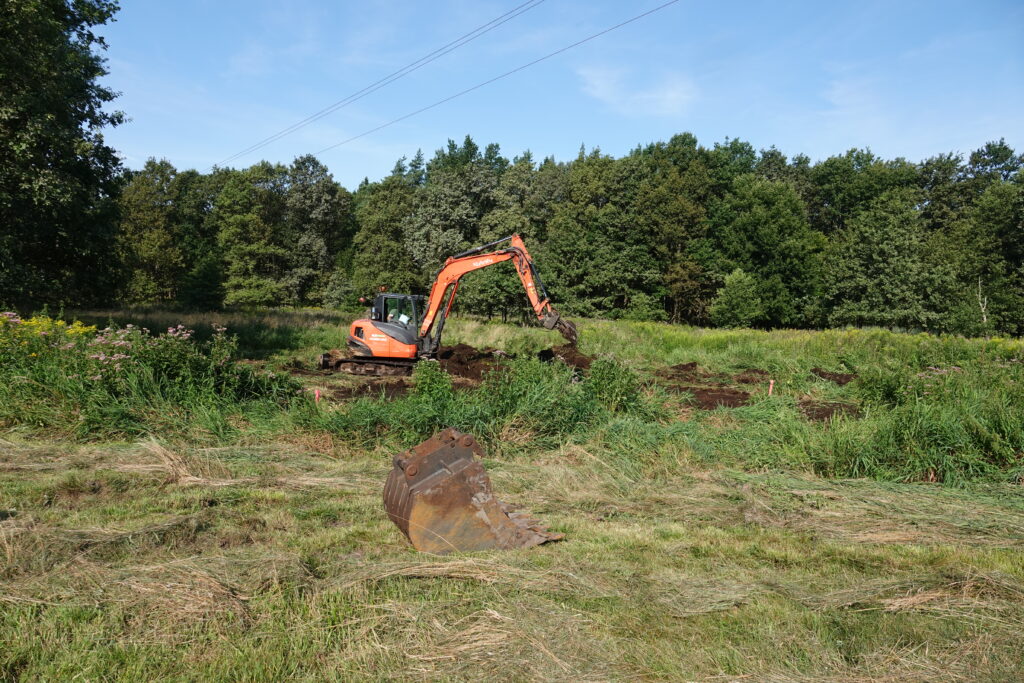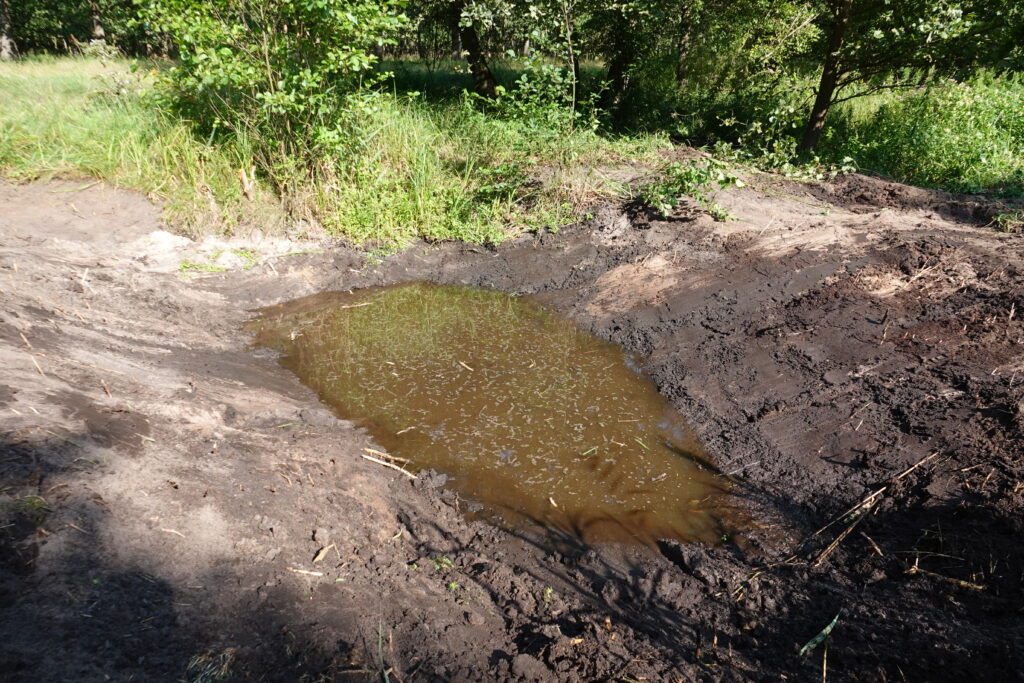 We wrześniu zakończona została realizacja kolejnych trzech kompleksów oczek wodnych w ramach poprawy stanu siedlisk dla płazów – traszki grzebieniastej Triturus cristatus 1166 oraz kumaka nizinnego Bombina bombina 1188, a także bezkręgowców -zatoczka łamliwego Anisus vorticulus 4056, kreślinka nizinnego Graphoferus bilineatus 1082, zalotki większej Leucorrhinia pectoralis 1042. Każdy kompleks oczek składa się z 5 różnorodnych zbiorników o powierzchni od kilkudziesięciu do kilkuset m2.